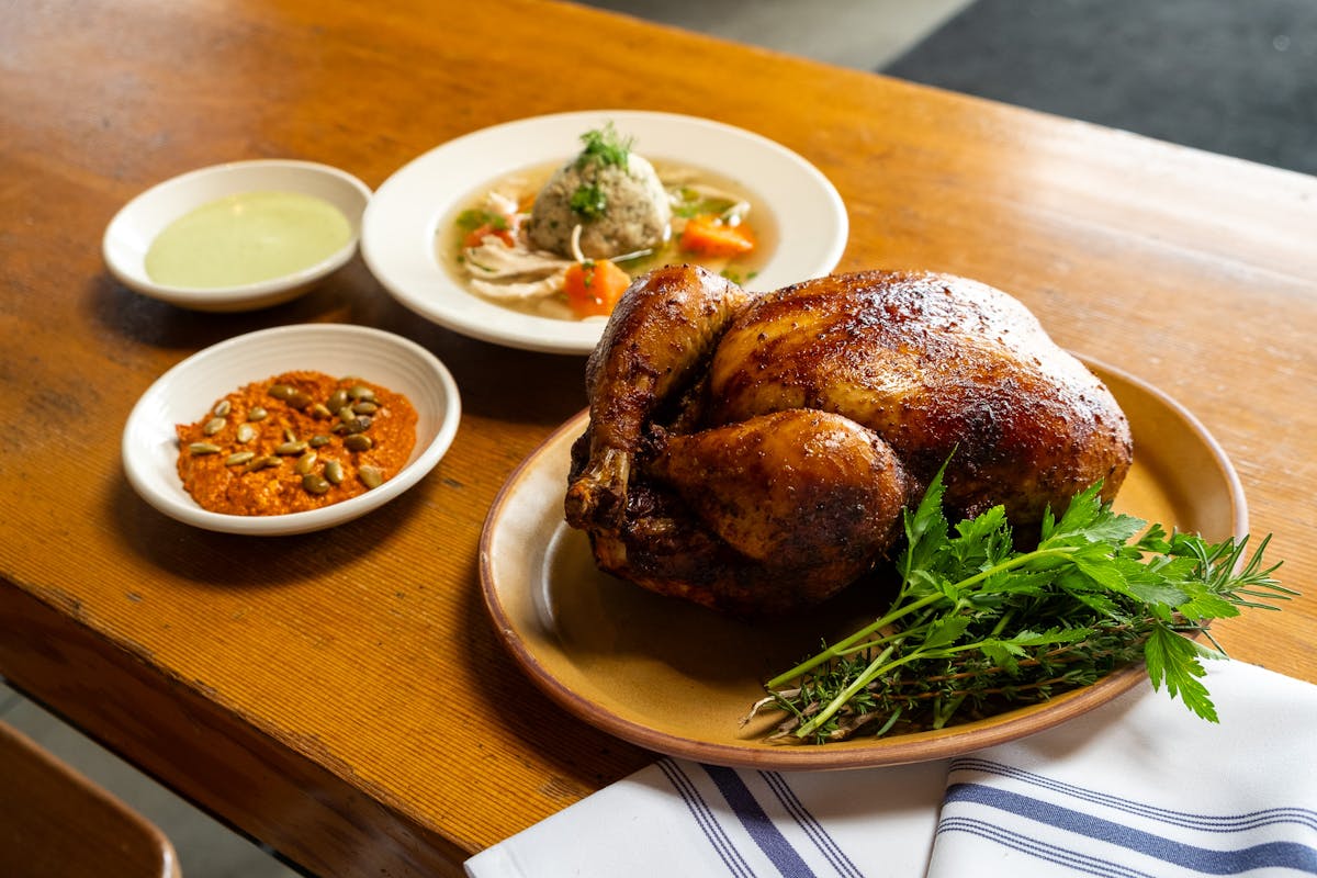 3.5-4lb whole chicken, green goddess dressing, pepita romesco, farmers market herb bouquet